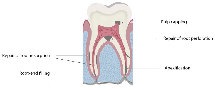 Рисунок 1. Схематическая диаграмма, демонстрирующая клинические области применения биокерамических материалов в эндодонтических процедурах.