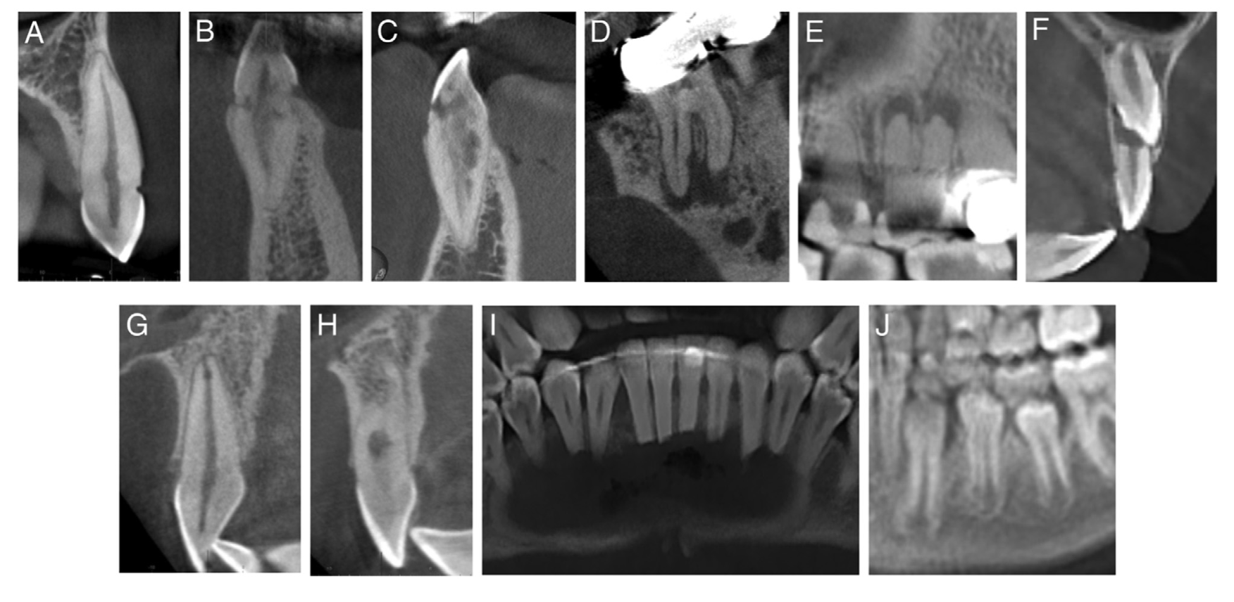 Типы резорбции корня: A–C — цервикальная резорбция корня с демонстрацией нарастающей тяжести; D — наружная воспалительная резорбция корня; E — апикальная резорбция, индуцированная инфекцией; F — резорбция, индуцированная давлением; G — внутренняя резорбция; H — внутренняя и заместительная резорбция; I — резорбция корня неодонтогенного происхождения; J — физиологическая резорбция корня.