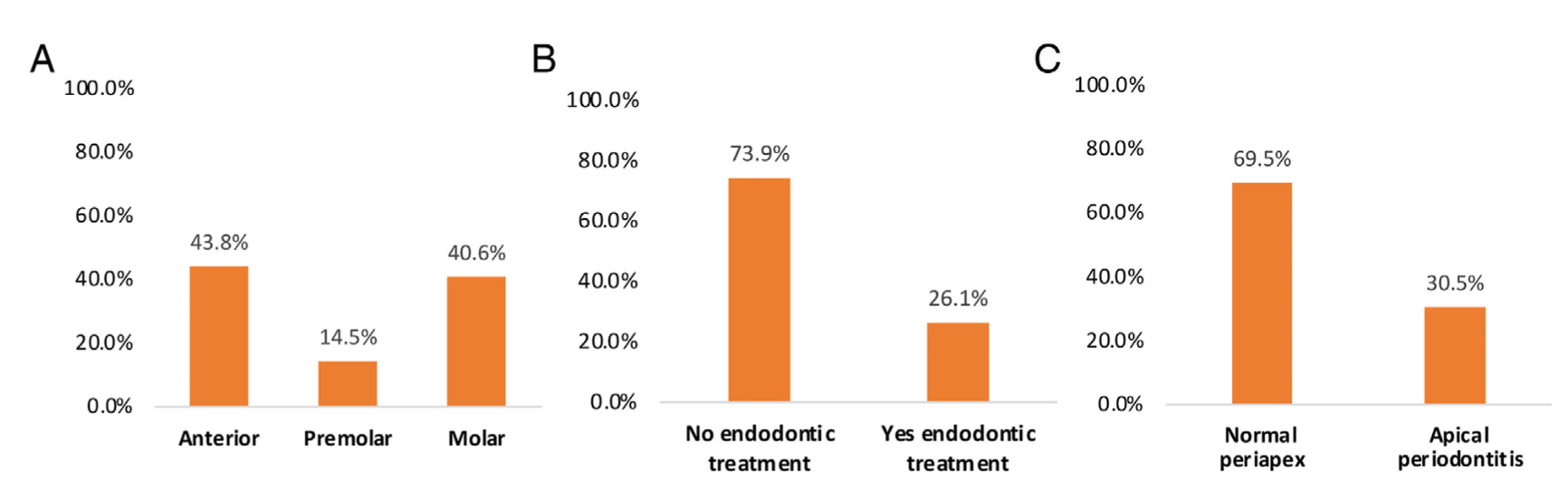 Рисунок 2. Характеристики зубов, у которых диагностирована резорбция (n = 249), в зависимости от: A) группы зубов; B) наличия предшествующего эндодонтического лечения; C) периапикального диагноза.