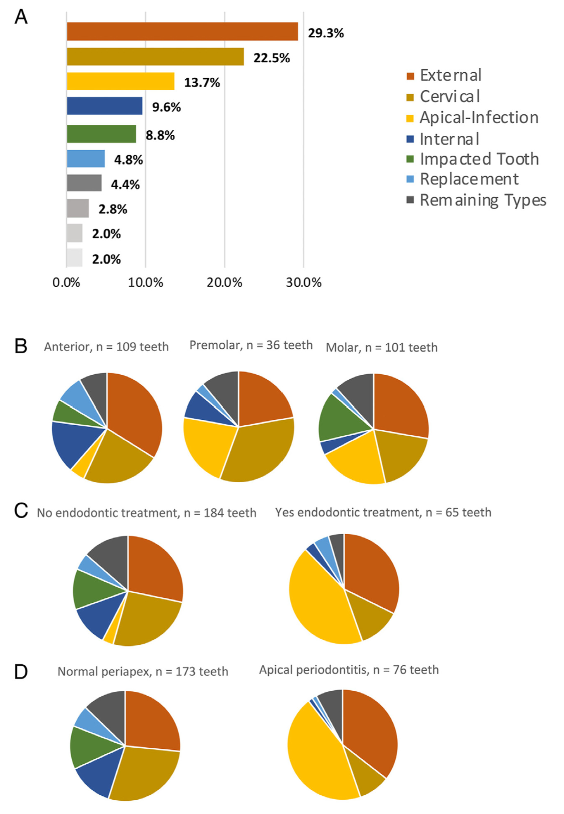 Распространённость типов резорбции для 249 поражённых зубов показана на Рисунке 3A. Наиболее частыми типами были: наружная (29,3%), затем цервикальная (22,5%), апикальная/инфекционно-индуцированная (13,7%), внутренняя (9,6%), индуцированная ретинированным зубом (8,8%) и заместительная резорбция (4,8%). Распространённость 6 наиболее частых типов резорбции анализировали в зависимости от клинических характеристик на уровне зуба (см. Рис. 3B–D). В выборке было лишь 3 молочных зуба, что составляет около 1% наблюдений с резорбцией.