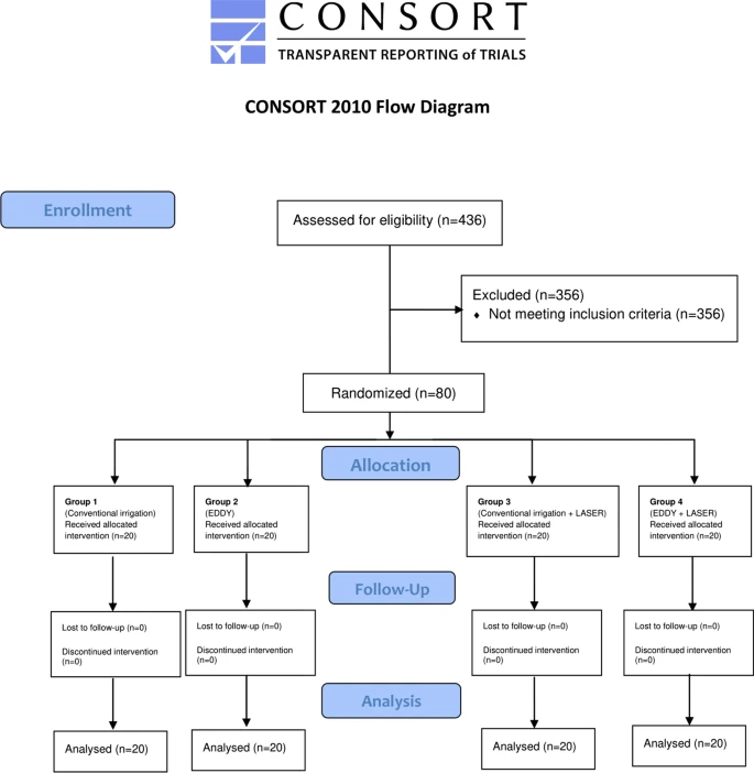 Насколько нам известно, на сегодняшний день отсутствуют исследования, оценивающие эффективность системы звуковой активации EDDY в снижении выраженности послеоперационной боли у зубов с симптоматическим апикальным периодонтитом. Кроме того, в эндодонтической литературе существует дефицит клинических исследований, посвящённых послеоперационной боли у симптоматических нежизнеспособных моляров. В связи с этим целью настоящего исследования было изучение выраженности послеоперационной боли после применения традиционной ирригации и системы EDDY, с использованием лазерной дезинфекции и без неё, при лечении моляров нижней челюсти с диагнозом симптоматический апикальный периодонтит.