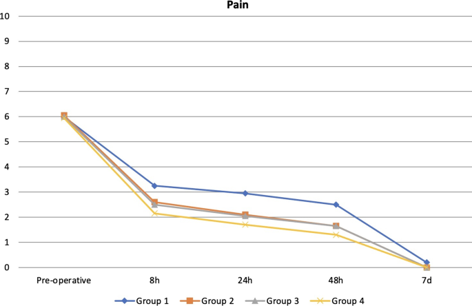 Пациентам было предложено фиксировать уровень послеоперационной боли и приём анальгетиков с использованием числовой рейтинговой шкалы через 8, 24, 48 часов и через 7 дней после процедуры.