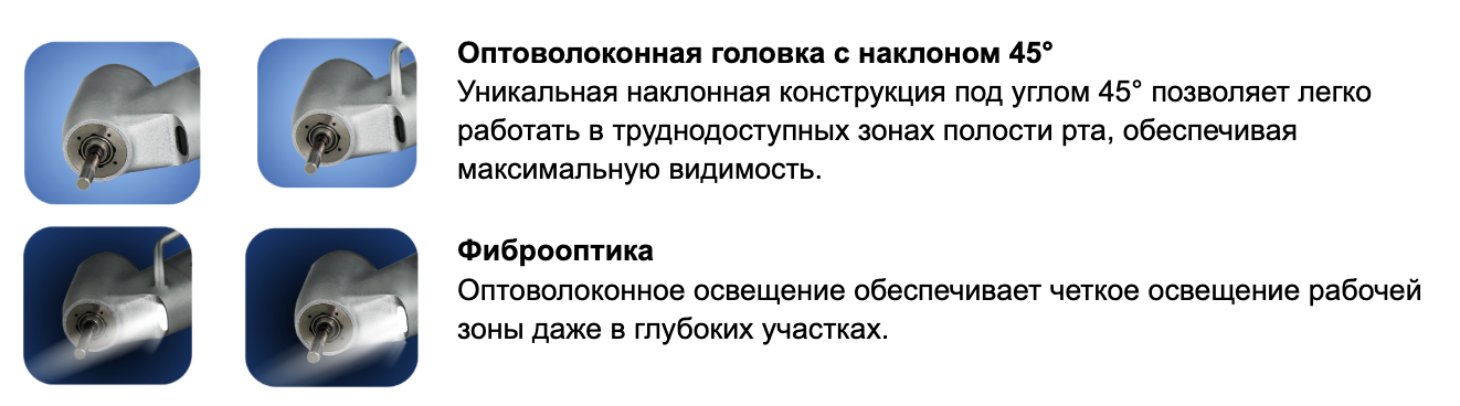 Угловой наконечник сочетает в себе высокую мощность, удобство и современный дизайн. С удобной угловой головкой с наклоном головки 45 градусов. Фиброоптика на базе оптоволокна обеспечивает более чёткий обзор рабочей зоны.
